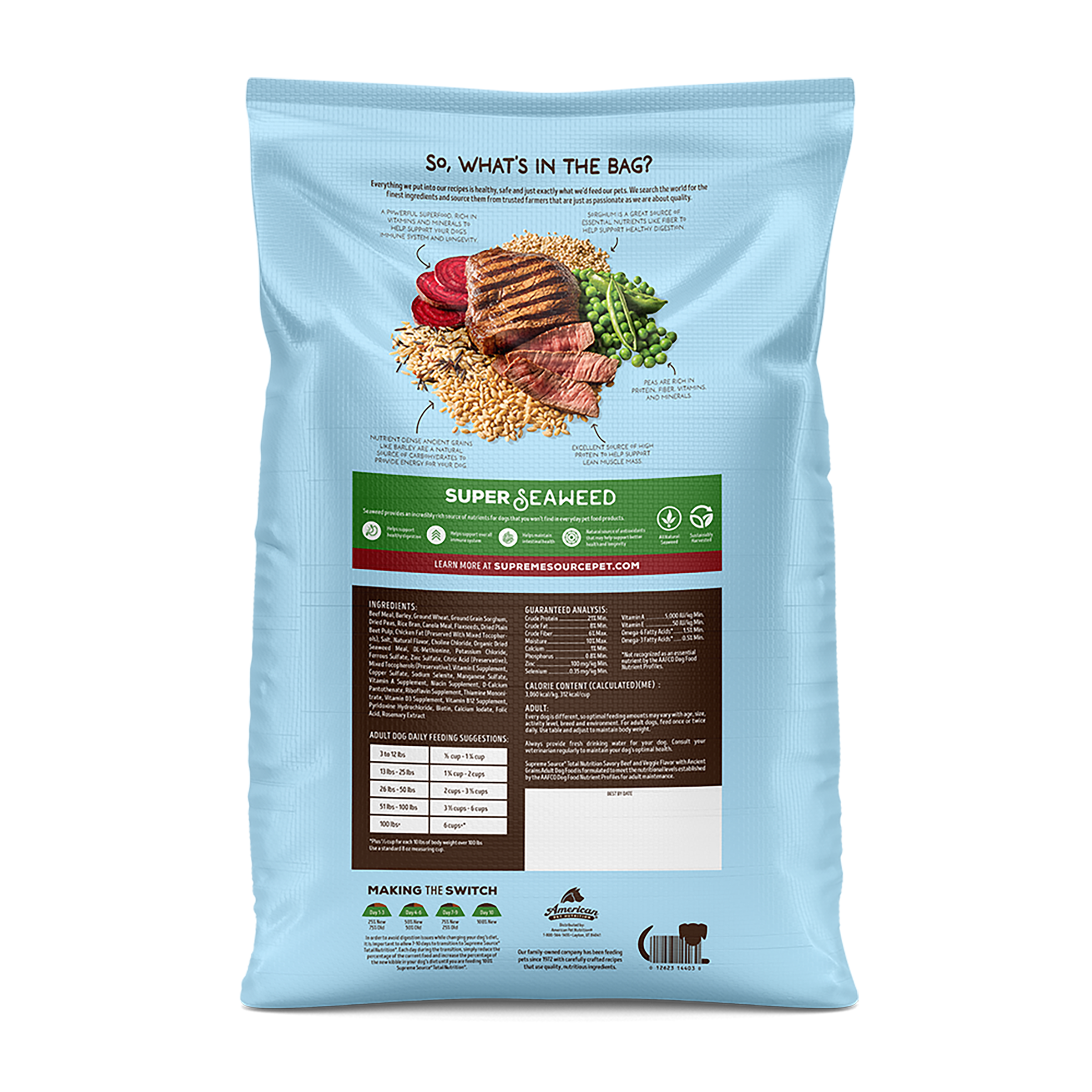 Supreme Source® Total Nutrition Savory Beef and Veggie Flavor with Ancient Grains Adult Dog Food is formulated to meet the nutritional levels established by the AAFCO Dog Food Nutrient Profiles for adult maintenance.